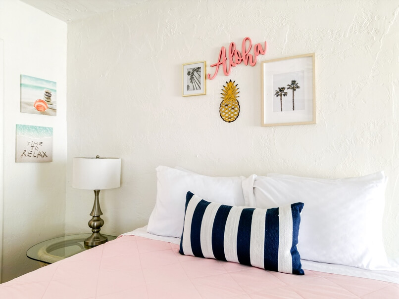The Island Oasis can accommodate up to four guests. There is a queen bed with a pink duvet in the bedroom and a sofa bed in the living room, sleeping up to four guests. This is great for a small family, a couple, or two couples visiting Clearwater together.